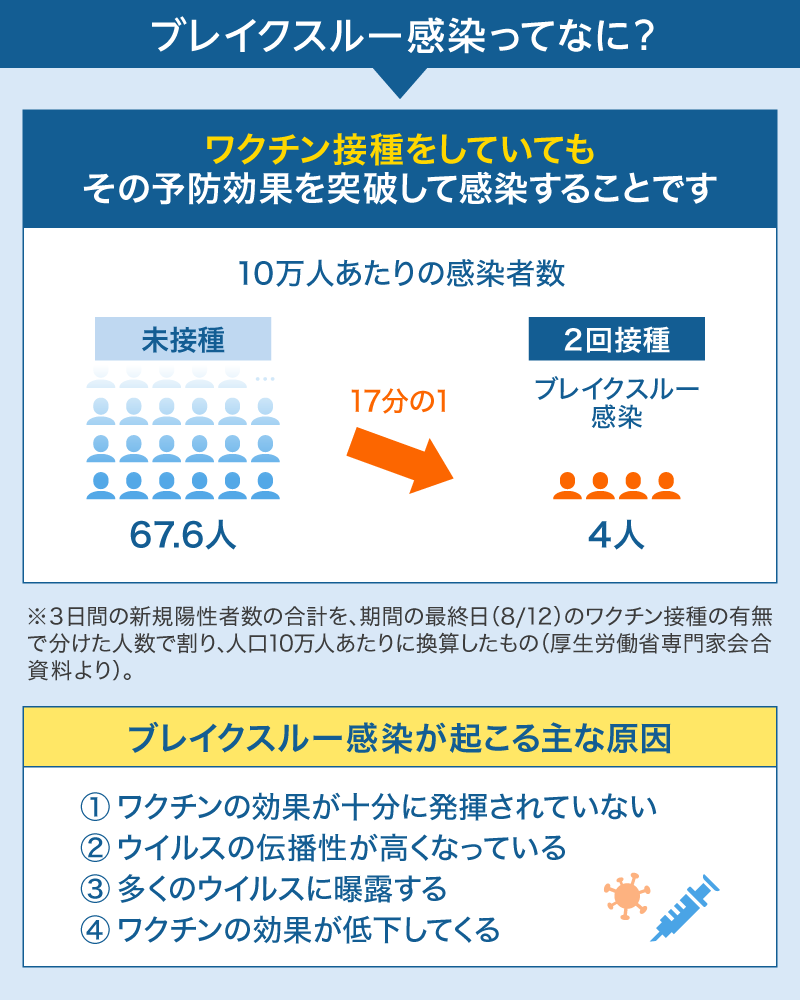ワクチンを2回接種していてもウイルスに感染する「ブレイクスルー感染」がまれに起こります。 原因はさまざまで、年齢や基礎疾患により抗体がつきにくくワクチンの予防効果が十分に発揮されない場合や、デルタなど伝播性(感染のしやすさ)が高い変異ウイルスの影響が考えられます。また多くのウイルスにさらされるとブレイクスルー感染のリスクは上がる可能性があります。 さらにワクチン接種後の経過日数とともに感染予防効果が低下することも原因のひとつと考えられます。 ブレイクスルー感染をしたとしても、ワクチンの重症化や死亡に対する予防効果は高く、接種していない感染者と2回接種完了したブレイクスルー感染者を比べると、入院リスクは29倍の差があったという米国の報告もあります。