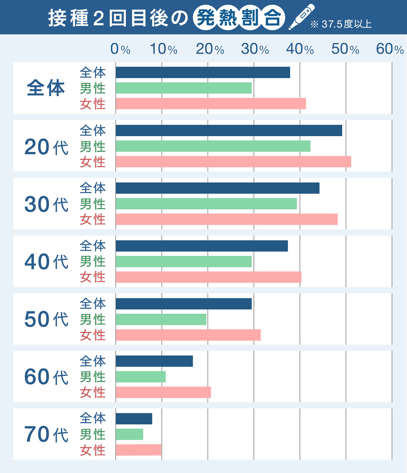 1回目接種後の発熱(37.5度以上)は3%であったのに対し、2回目の接種後は38.4%の高い割合で発熱が報告されています。 年齢および性別によって発熱の副反応頻度は異なり、若いほど、また女性の方が高く現れました。